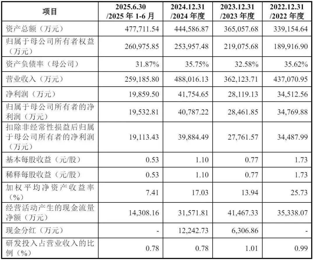 2022年至2025年上半年,公司实现营业收入分别为43.71亿元、36.21亿元、48.8亿元和25.92亿元。同期,净利润分别为3.45亿元、2.81亿元、4.18亿元和1.99亿元。