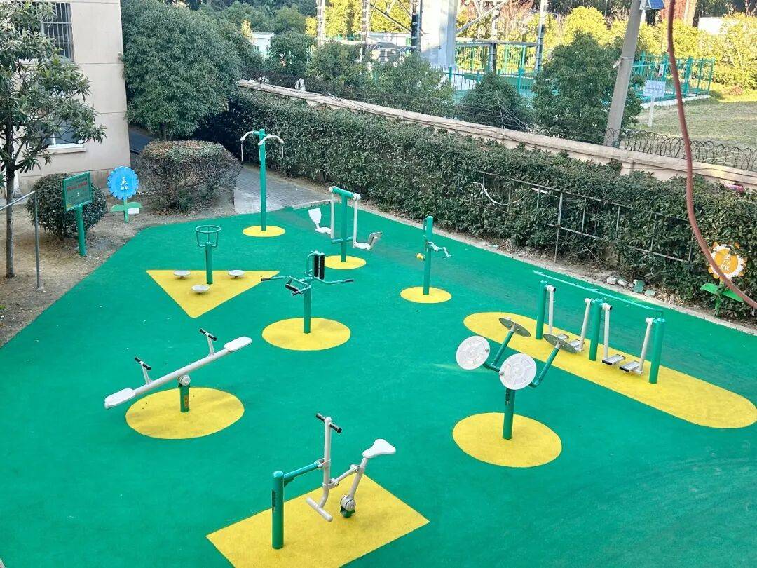 走出楼道,社区的公共活动区域也迎来了“升级”。老人健身区、儿童游乐区、议事凉亭三处空间通过整合与提升,实现了功能互补与环境美化。地面换上了防滑耐磨的塑胶,健身与游乐设施更加安全丰富。社区聚焦“全龄友好”理念,通过花箱、展墙等设计,让这里成为孩子们嬉戏、老人们锻炼、邻居们闲谈的惬意场所。