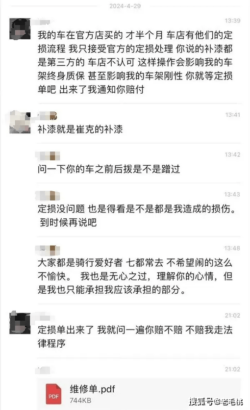 据曝光的聊天记录显示,自行车主表示自己的车是崔克牌,在官方店铺购买不到半个月,只接受官方定损处理。