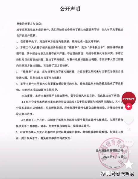 针对此事,TREK崔克自行车温州官方发布了一则公开声明,对事件做出了解释和道歉。