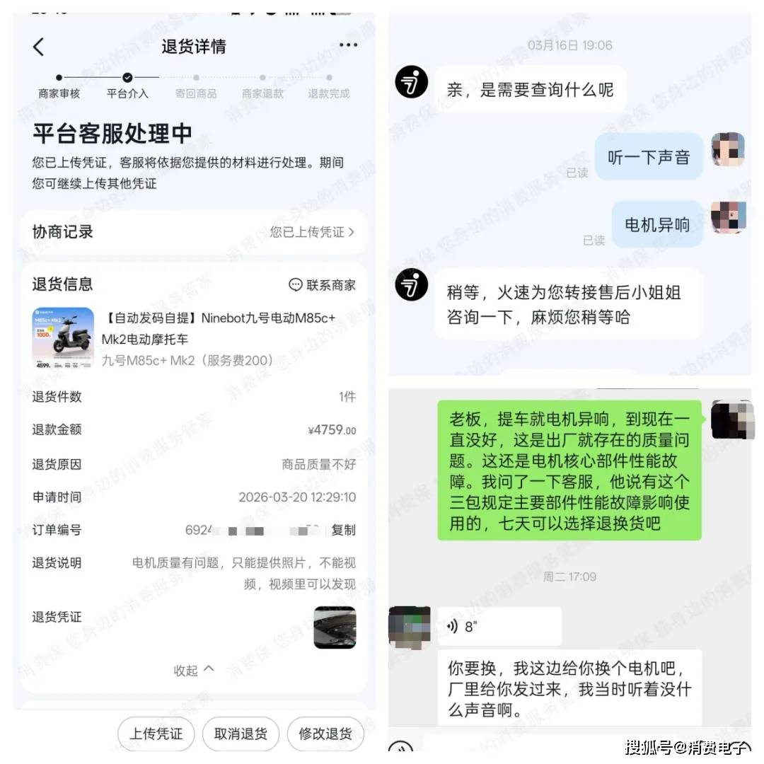 电机异响:提车当天即出现电机异响,第3天商家确认可更换电机,但要求“等两天看还会不会响”。后经九号官方一键报修确认电机存在质量问题,可更换新电机。