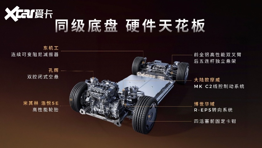 零跑D19底盘架构100%自研,搭载前双叉臂、后五连杆独立悬架,经中欧联合专业团队精细化调校,兼顾操控精准与乘坐舒适。纯电版三电机四驱,最大功率540kW、峰值扭矩745N·m,零百加速3秒级,双矢量电驱可实现毫秒级扭矩分配,过弯更稳、加速更强。同时,新车还配备孔辉双腔闭式空气悬架、东机工连续可变阻尼减振器,搭配博世华域R-EPS转向、欧摩威(原大陆)MKC2线控制动、四活塞前固定卡钳和米其林高性能轮胎,硬件规格媲美百万级豪车。