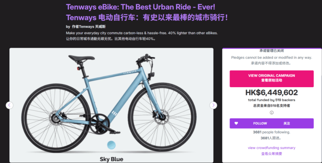 品牌成立初期,TENWAYS 并没有直接重资产铺渠道,而是选择通过众筹进行“轻启动”。在成立一年后,其在 Indiegogo 上推出首款产品 CGO600,最终获得 3681 人支持,众筹金额达到 644.9 万港元,成为当时的爆款项目。