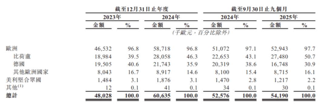 而从市场结构来看,TENWAYS 的业务高度集中在欧洲,且占比逐渐提升。招股书显示,2025年欧洲市场收入约 5294.3 万欧元,占公司总收入的97.7%(截至9月30日止九个月),美国和其他地区占比极小。