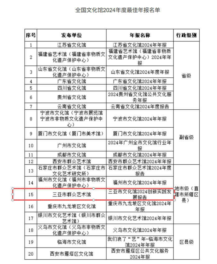 2025年10月14日上午,全国文化馆2024年度年报征集展示工作的遴选结果正式揭晓。经过专家评选,由海南省文化馆推荐,三亚市文化馆编撰的《三亚市文化馆2024创新实践发展报告》成功入选全国文化馆2024年度“最佳年报”,成为全国20佳之一。