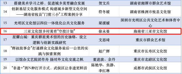 2025年11月8日,国家公共文化云平台公布中国群众文化学会2025年群众文化创新发展征文获奖名单。其中,由三亚市文化馆申报的《三亚文化馆乡村美育“空投计划”》荣获2025年群众文化创新发展征文(创新实践案例)二等案例。