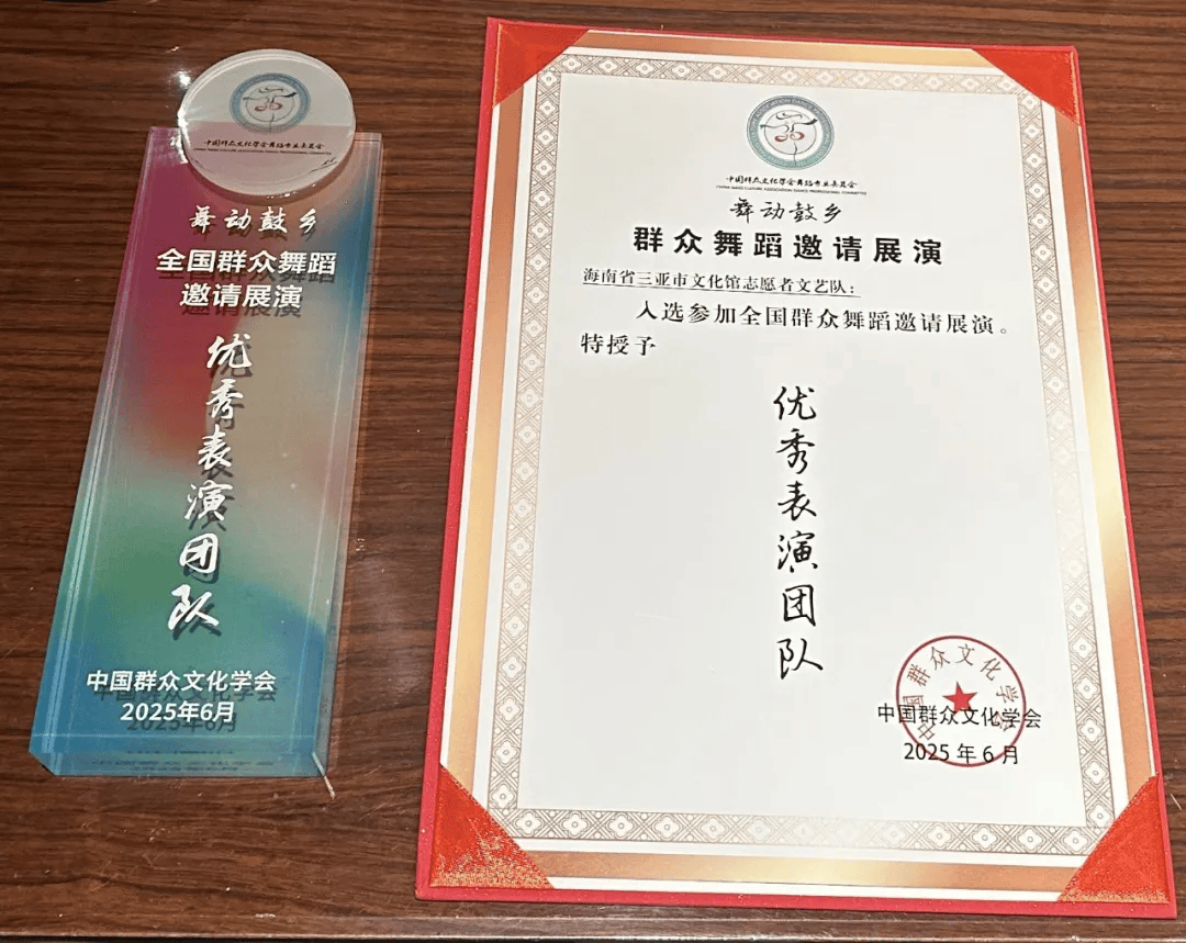 2025年6月26日晚,“舞动鼓乡”全国群众舞蹈展演开幕式及展演在陕西省延安市安塞区体育运动广场举行。13支来自全国各地的舞蹈队伍齐聚一堂,为全国人民送上一场艺术盛宴。由海南省三亚市旅游和文化广电体育局选送的三亚市文化馆志愿者文艺队受邀参加展演,以精彩的表现荣获“优秀表演团队”称号。