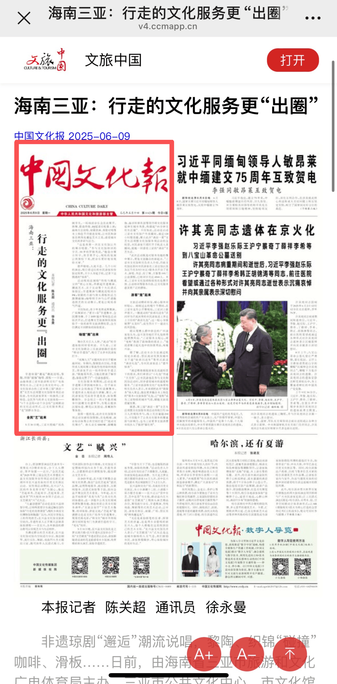 2025年6月9日,第三届“清凉一夏”文艺生活周暨文化馆服务周活动以《行走的文化服务更“出圈”》为题,登上《中国文化报》头版。活动创新融合非遗琼剧与潮流说唱、黎陶织锦与咖啡滑板等多元内容,通过“1个主会场+12个分会场”全域联动形式,推动公共文化服务走向街头、走进社区,真正“走”到群众身边。此次头版报道,不仅展现了三亚文旅融合的创新活力,也标志着我市群众文化工作在覆盖面、影响力方面实现新的突破,为进一步提升城市文化软实力积累了宝贵经验。