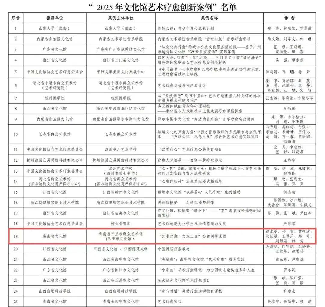 2025年12月5日—2025年12月7日,由中国文化馆协会与浙江省文化馆共同主办的2025年全国文化馆艺术疗愈创新案例交流活动在浙江台州三门举行。三亚市文化馆推荐的创新案例《“艺术疗愈·文旅三亚”公益训练课程》成功入选“2025年文化馆艺术疗愈创新案例征集展示活动”正式名单。其中,共有11个优秀案例获邀进行现场分享,三亚市文化馆的案例位列其中。