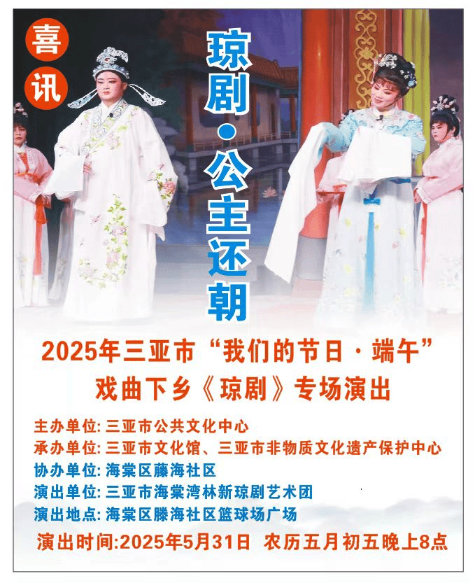 2025年5月30日—2025年5月31日,在海棠区洪风社区、藤海社区开展2025年三亚市“我们的节日·端午”戏曲下乡琼剧专场演出戏曲下乡琼剧专场演出,丰富海棠人民群众文化,更是非遗保护的重要工作。