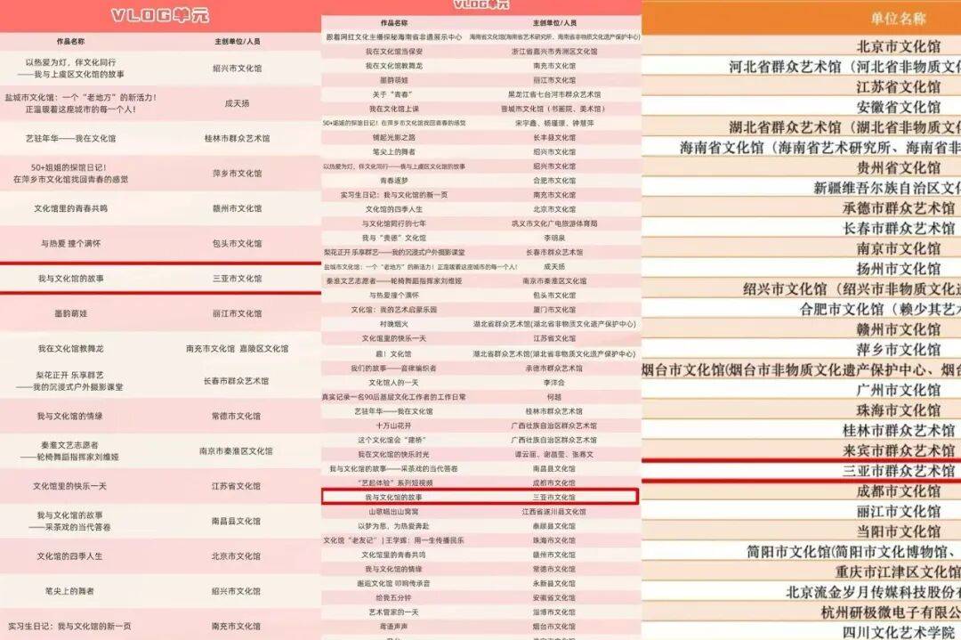 2025年12月8日,三亚市文化馆获得2025年“我与文化馆”创意短视频征集活动人气作品(VLOG单元)、百部优秀作品(VLOG单元)、优秀组织单位三大奖项。