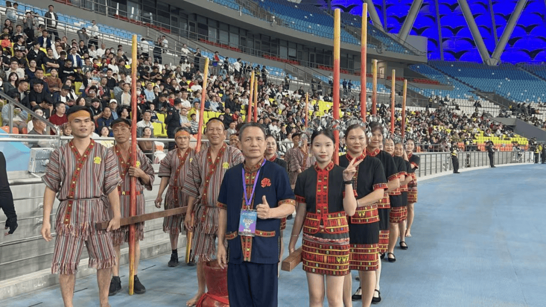 2025年11月22日—2025年11月23日,海文名家工作室——暨“百姓舞台”非遗展演活动在海口精彩上演。来自三亚的非遗传承人符家福、符学城、高小龙联袂登场,表演了充满力量的黎族传统钱铃双刀棍棒舞。三位舞者以棍为骨,以铃为韵,在铿锵有力的节奏中展现攻守腾挪的古老武舞精髓。双刀翻飞似银练,棍棒起落生风,钱铃清响如雨,刚柔并济的招式间流淌着黎族先民的勇毅与智慧。他们以矫健身姿演绎山野狩猎、御敌自卫的历史记忆,更在传统步法中融入当代舞台张力,赢得现场阵阵喝彩。这场表演不仅再现了非遗的鲜活生命力,更让观众深切感受到黎族文化中昂扬不息的精神魂魄。