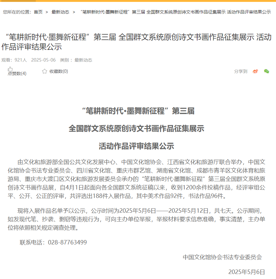 2025年5月6日,四川公共文化云平台公示“笔耕新时代·墨舞新征程”第三届全国群文系统原创诗文书画作品征集展示活动作品评审结果。由三亚市文化馆报送的徐永曼美术作品《3.3.3.年轮》和王仁俊书法作品《海南热带雨林诗》入展。