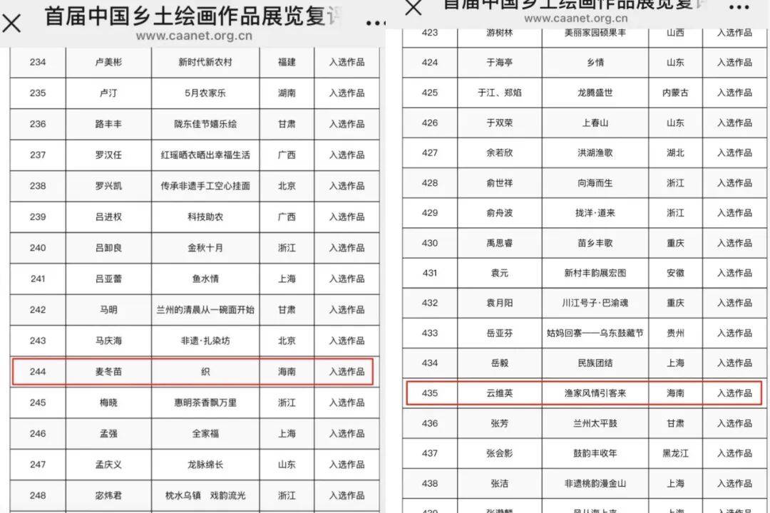 6月从中国美术家协会官网获悉,我省画家云维英创作的美术作品《渔家风情引客来》,麦冬苗创作的《织》入选由中国美术家协会、上海市文学艺术界联合会、上海市金山区委员会、上海市金山区人民政府、北京大学艺术学院共同主办的“首届中国乡土绘画作品展览”。