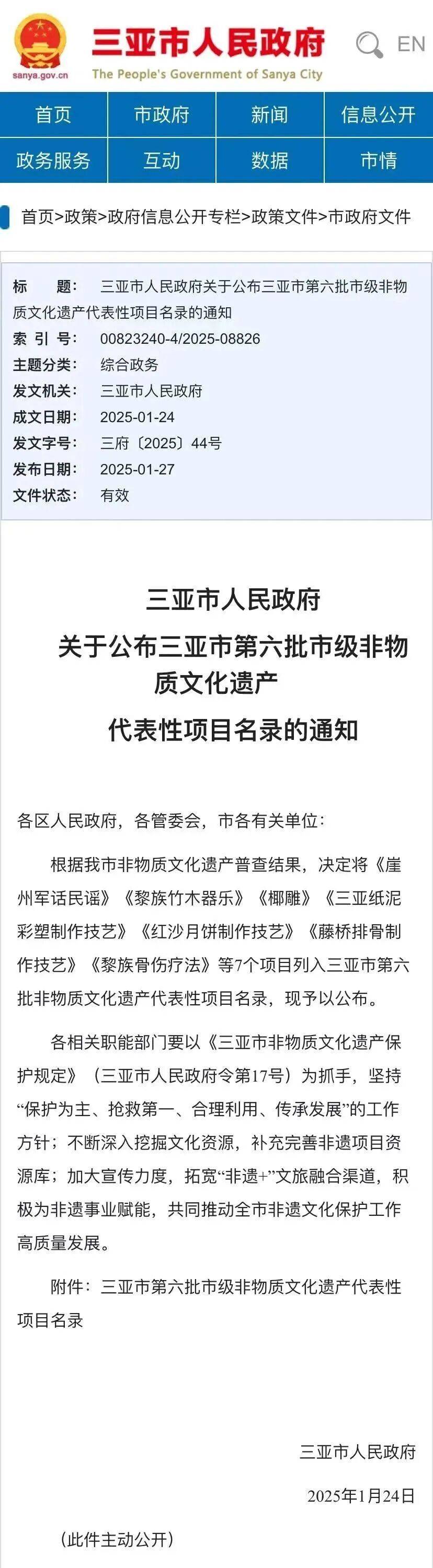 2025年1月24日,三亚市人民政府公布第六批市级非物质文化遗产代表性项目名录。《崖州军话民谣》《黎族竹木器乐》《椰雕》《三亚纸泥彩塑制作技艺》《红沙月饼制作技艺》《藤桥排骨制作技艺》《黎族骨伤疗法》共7个项目获批入选。